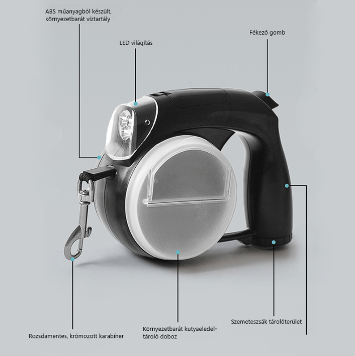 Unod, hogy séta közben külön kell cipelned a vizespalackot, a jutalomfalatot és a zseblámpát? Ez a multifunkciós kutyapóráz mindent egyben kínál: